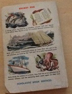 I was at Epoch for a writing sprint with Rebecca Schwarz, and afterwards I went over to Blue Velvet to window shop because they weren’t open yet, the slackers. In the window artfully arrayed were three books. One was Flash, about a mustang, which yes, I had read. There was a vintage Harlequin too, and then off to the right, the treasure, the grand prize, the book for which the heavens opened and the angels cried hosanna! Robb White’s Secret Sea.